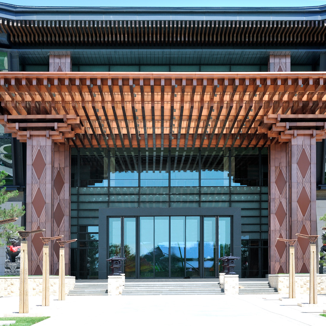 作为2014APEC 峰会的会址,北京雁栖湖国际会都对产品的技术方案、环保要求、制造工艺、文化特色及建筑艺术的要求几近完美。作为项目的总概念设计方,美国AECOM 建筑秉承“对环境负责,以人为本”的设计理念,对即将迎接世界各国和地区首脑检阅的大门,尤其要求严格贯彻自己的设计理念。由于雁栖湖国际会都地处北方,冬天最低温度经常处于-10~-20 摄氏度之间,同时四面环水,空气潮湿,无论是高达4200mm 的61 樘门扇、轨道,还是地锁,都面临低温变形和潮湿腐蚀的双重难题,同时对承重也提出了考验。门老爷经过一系列的现场勘察和测量,提出了“断桥型材+ 隐藏式管状液压式闭门器”这一创新的组合方案,兼顾环保和安全,本方案和AECOM 建筑的理念完美契合,为行业发展又提出了一条新思路。